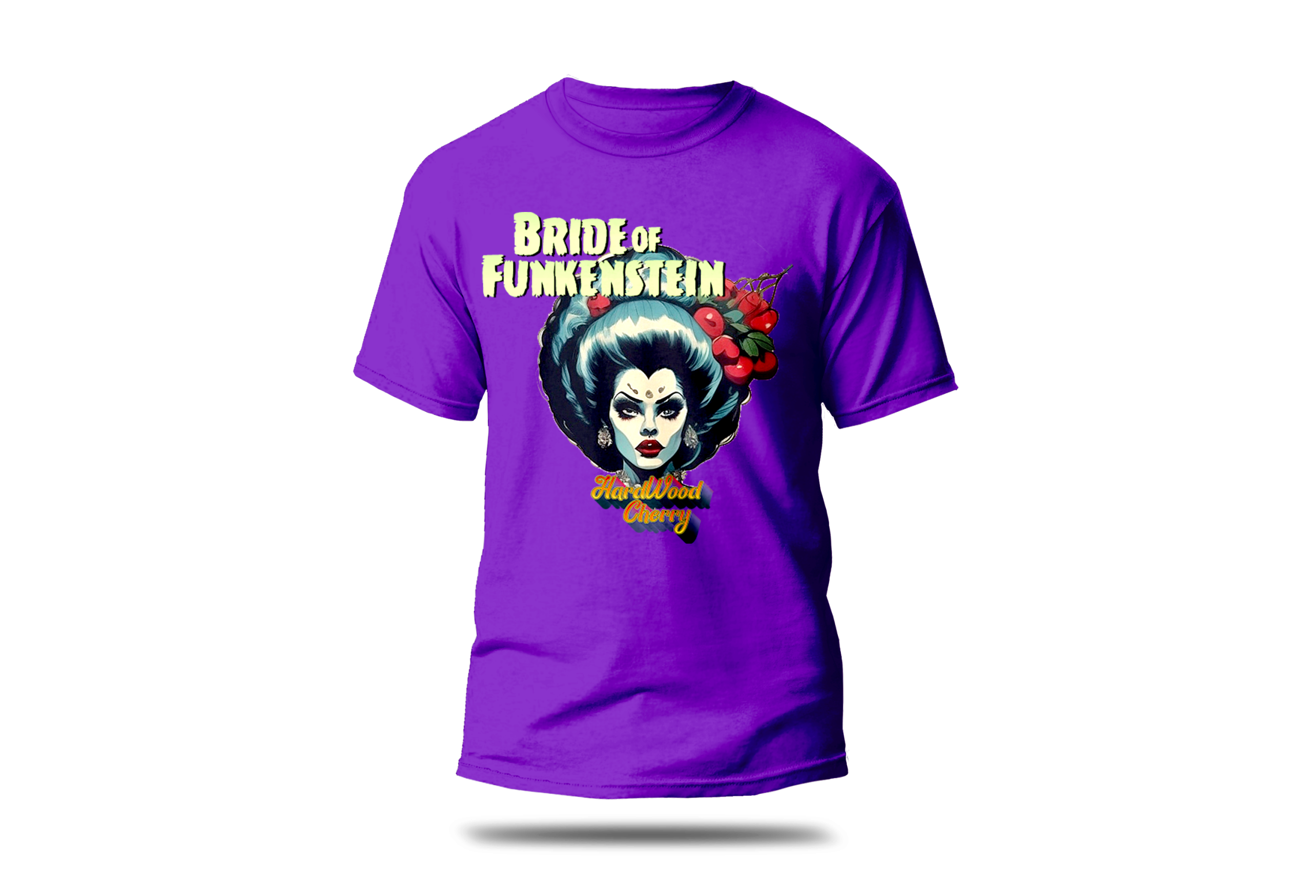 Printed on a bold purple tee, this design features the Bride herself, decked out in vintage monster style with a HardWood Cherry twist — complete with a crown of cherries. It’s eye-popping, playful, and packed with the same funky energy that makes the song a fan favorite.